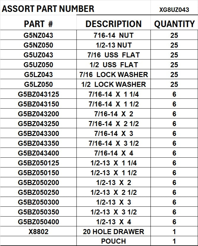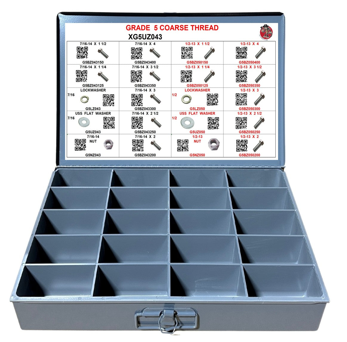 GRADE 5 COARSE 043 050 716-14 1/2-13 BOLTS NUTS USS FLAT WASHER LOCK WASHER 20 HOLE DRAWER LABEL. PAIRS WITH ASSORTMENT XG5UZ025